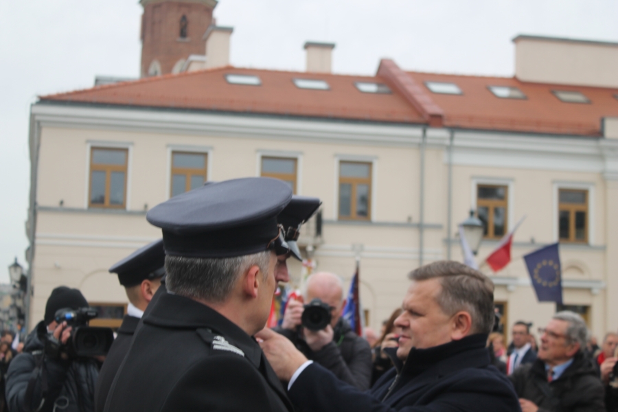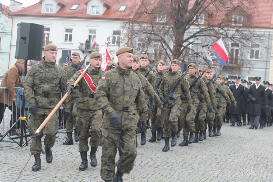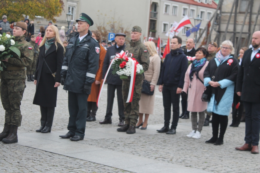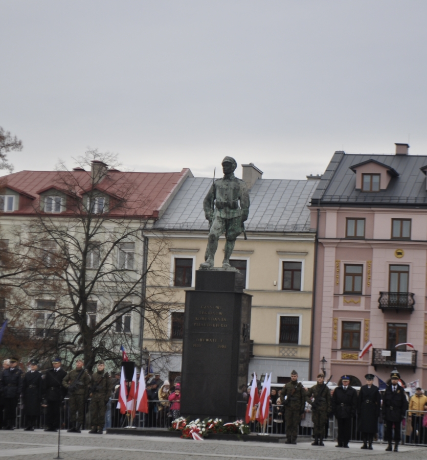 Goście i organizatorzy Święta Niepodległości,  nadający ton rocznicowej uroczystości , kontynuowanej na Rynku przy Pomniku Czynu Legionów Józefa Piłsudskiego,  akcentowali